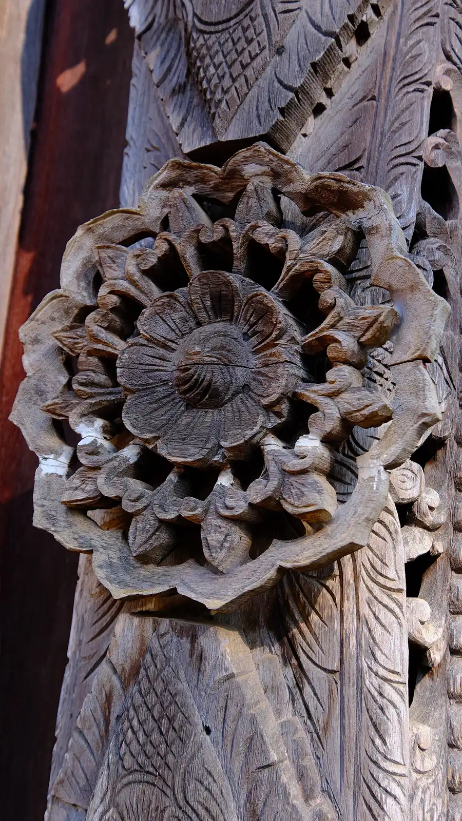Архитектура и дизайн: Здания выполнены из темного дерева и украшены элементами, вдохновленными буддизмом, а также мистическими и сюрреалистическими мотивами.