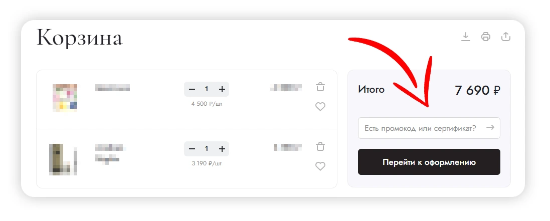 - Введите уникальный код сертификата в поле «Промокод» при оформлении заказа.